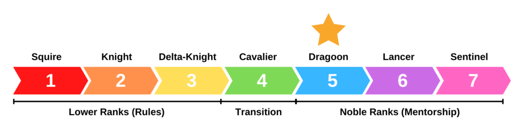 A Dragoon is the fifth Rank, or “level,” that any Sword Tag participant achieves. Dragoons have an understanding of Courage and Mentorship. Dragoons seek to understand and demonstrate the values of Leadership and Patience. This is a the first of the Noble Ranks now that the participant has demonstrated that they are willing and able to mentor others and have shown their mastery of the rules.